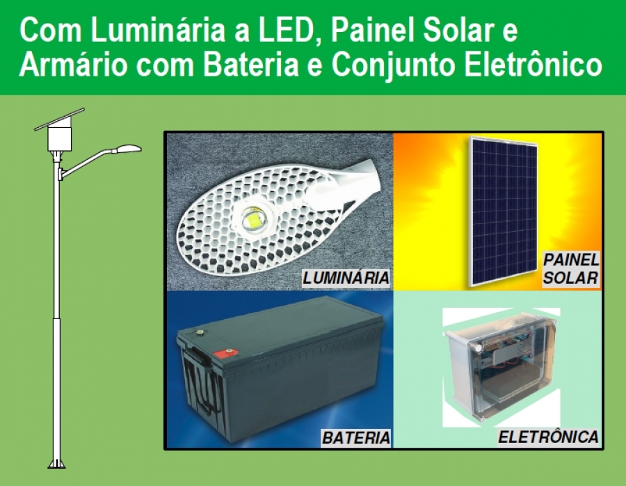 O Poste Solar é composto basicamente por um módulo ("painel") solar com longa vida útil, uma luminária a LED, uma bateria estacionária e um gabinete com controlador de carga, comutador, temporizador e driver para a luminária.